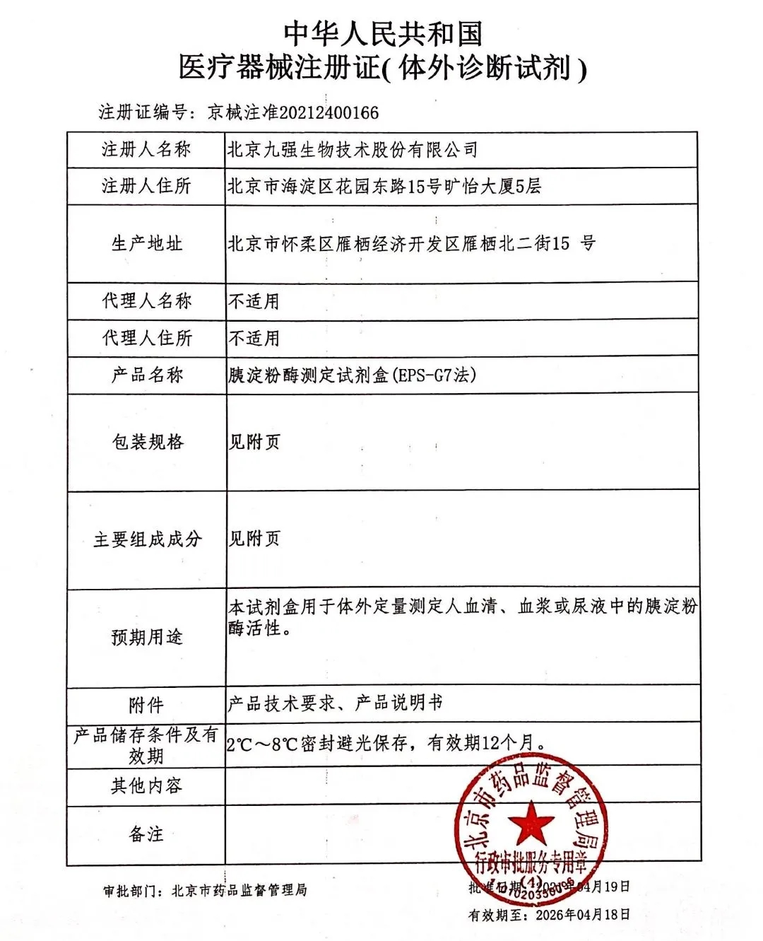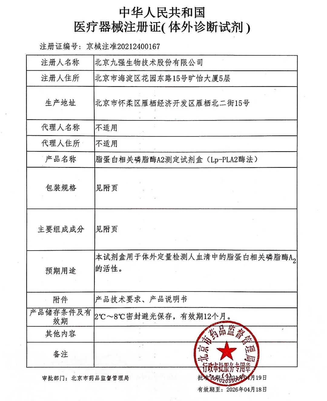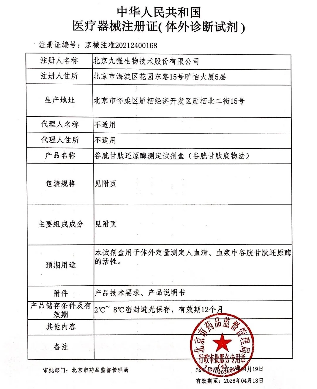 九強生物順利取得北京市藥品監(jiān)督管理局頒發(fā)的三項產(chǎn)品的《醫(yī)療器械注冊證》:谷胱甘肽還原酶(液體)測定試劑盒(谷胱甘肽底物法)、脂蛋白相關(guān)磷脂酶A2測定試劑盒(Lp-PLA2酶法)胰淀粉酶測定試劑盒(EPS-G7法)
