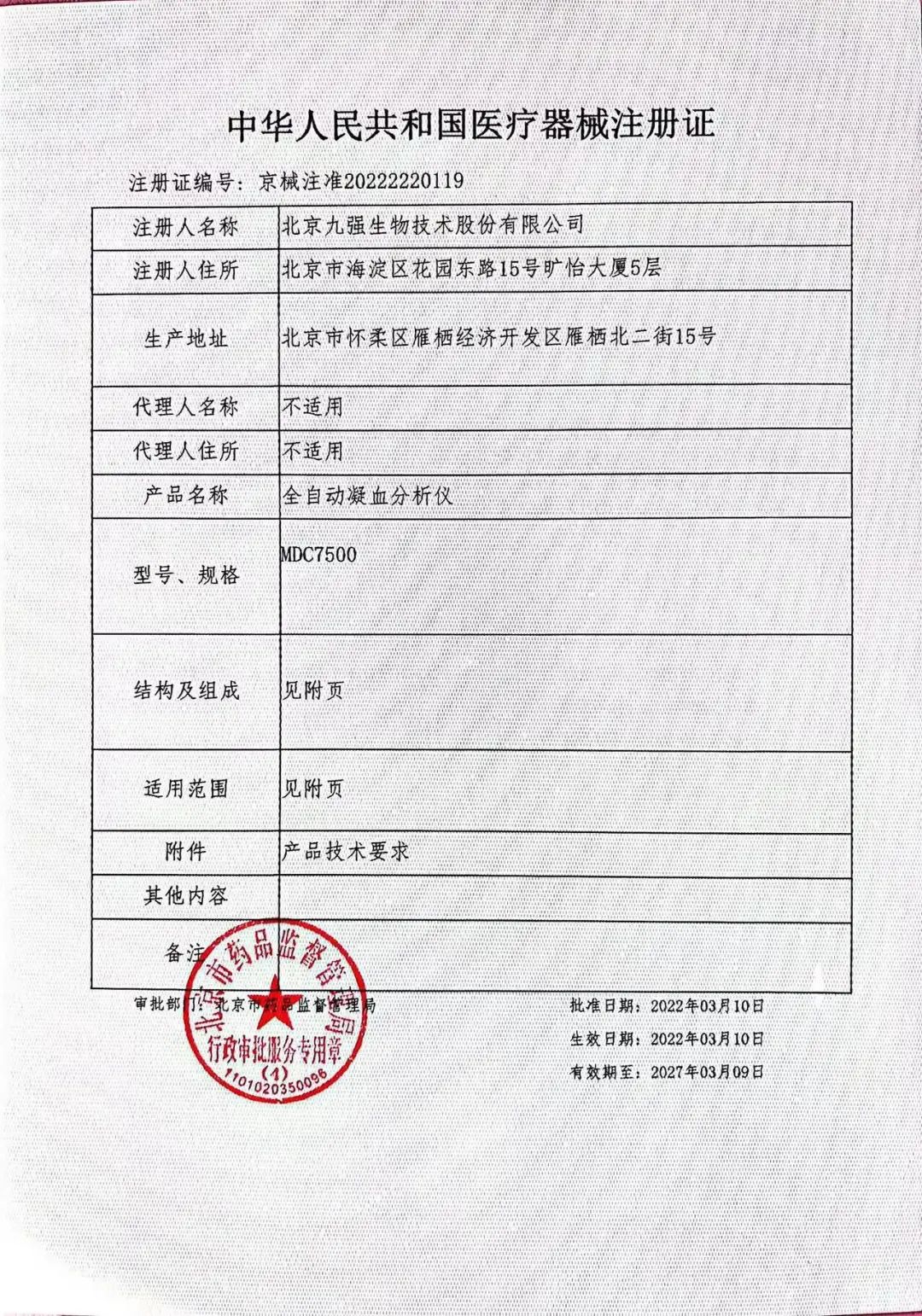 九強(qiáng)生物全自動凝血分析儀MDC7500順利取得北京市藥品監(jiān)督管理局頒發(fā)的《醫(yī)療器械注冊證》。