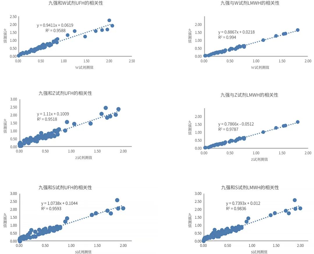(2)國(guó)產(chǎn)抗Xa試劑可以滿足臨床預(yù)期用途:九強(qiáng)抗Xa試劑盒普通肝素線性可以做到4IU/mL,不僅可以滿足說(shuō)明書所宣稱的1.2IU/mL,同時(shí)可以滿足臨床上的一些異常特殊高值樣本的檢測(cè)需求;