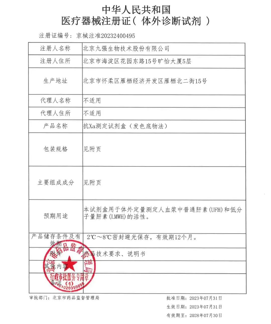 九強(qiáng)生物抗Xa(發(fā)色底物法)順利取得北京市藥品監(jiān)督管理局頒發(fā)的《醫(yī)療器械注冊證》。