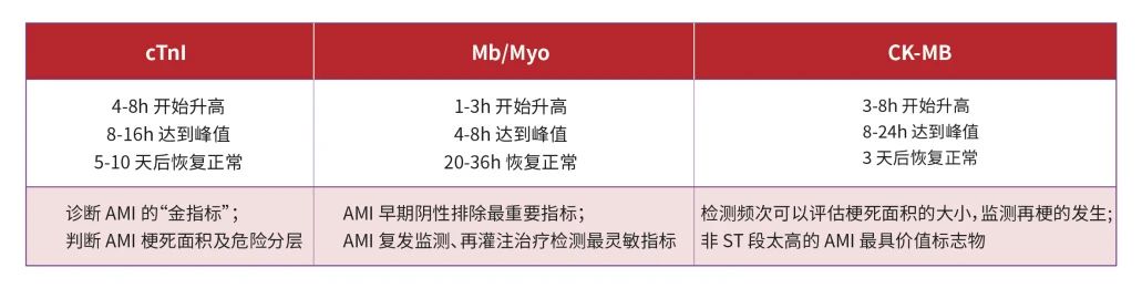 心肌細(xì)胞損傷后,細(xì)胞內(nèi)各種成分進(jìn)入血液循環(huán),其中某些成分能較為特異和敏感地反應(yīng)心肌損傷,成為心肌損傷標(biāo)志物。心肌損傷標(biāo)志物與臨床表現(xiàn)、心電圖一起為心肌梗死診斷提供依據(jù)[4]