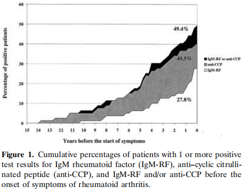 研究表明,Anti-CCP在患者首次RA癥狀出現(xiàn)前的14年前即可在血清中被監(jiān)測(cè)到,且具有一定的預(yù)測(cè)價(jià)值[2]。