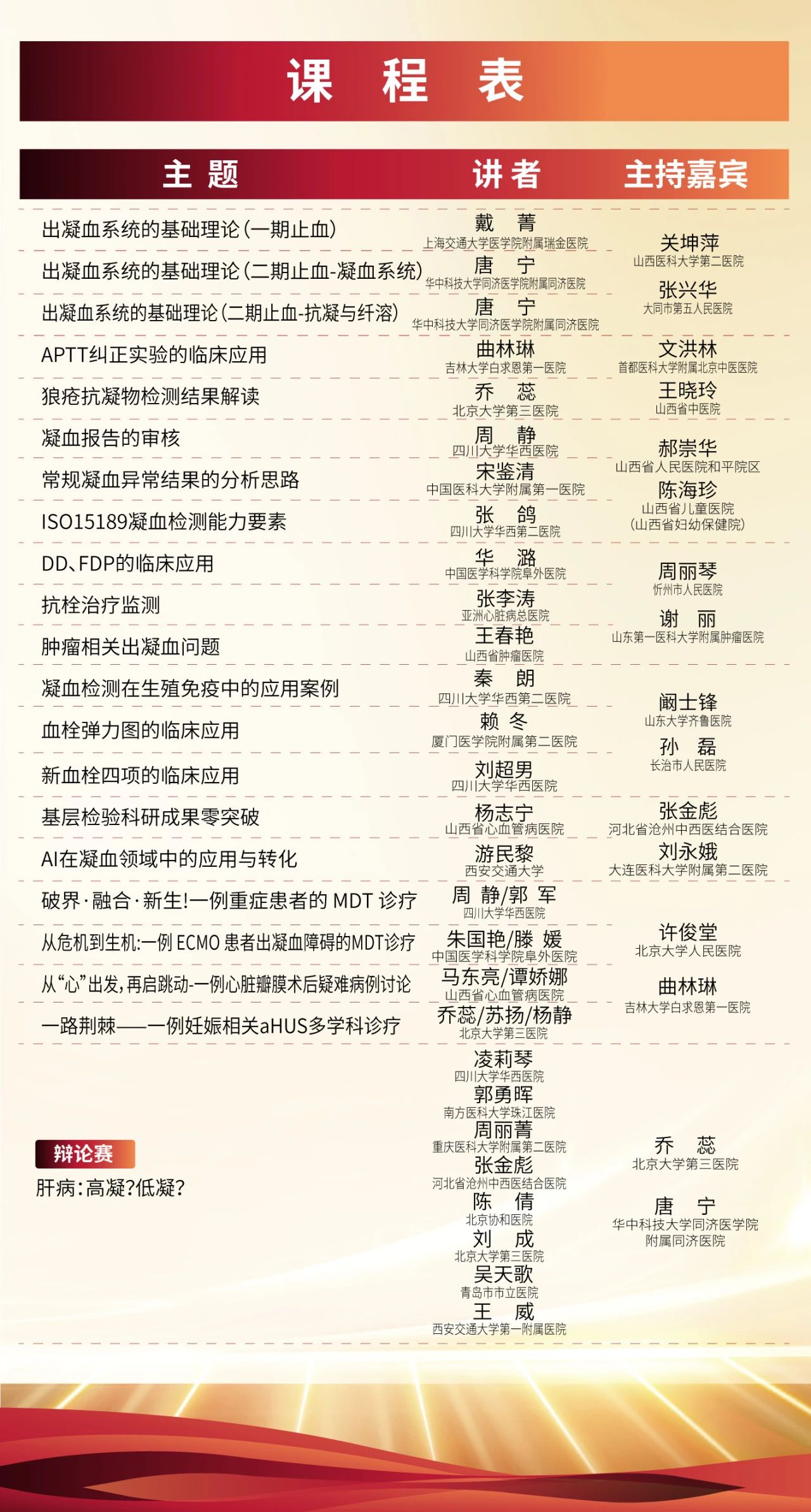 本次培訓(xùn)邀請(qǐng)國內(nèi)凝血領(lǐng)域知名專家授課,課程內(nèi)容涵蓋出凝血系統(tǒng)基礎(chǔ)理論、多學(xué)科聯(lián)合診療(MDT)經(jīng)典案例拆解,辯論賽以及AI在凝血領(lǐng)域的應(yīng)用。