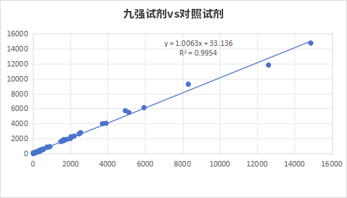 九強(qiáng)試劑與市場(chǎng)主流對(duì)照試劑比對(duì)一致性良好,R2>0.99